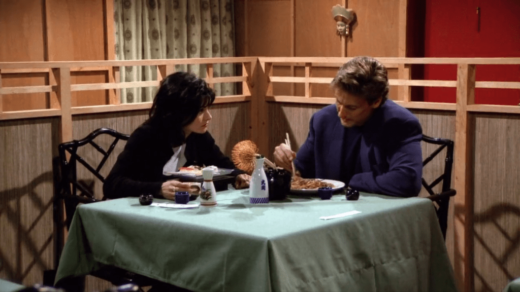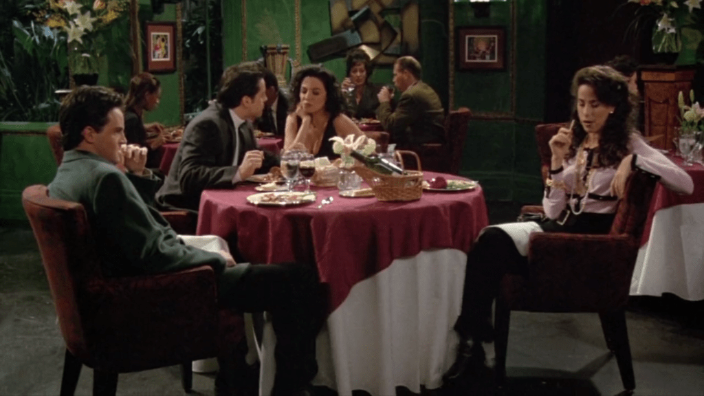 If we look at the first couple of seasons we see that the clothing styles for the dates are very formal. We can see the women wearing dresses and the men wearing suits or blazers. By the way they dress we can infer that dates were more serious occasions earlier. A lot of thought goes behind how they dress up, how they fix their hair and even the shoes, accessories and jewelleries they wear. The color of the dress their dress also tells us a lot about how they want to express themselves. While most of the time the people wear more formal black, grey, dark blue colors occasionally we see someone wearing more bold colors like red. For example, when Joey goes out with a fan she is dressed in red from top to bottom and is much more confidant and dominating whereas Joey is very casually dressed. There dressing represents the intentions with which they are at the date.